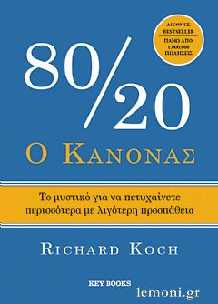 Ένα βιβλίο που θα σας βοηθήσει να ανακαλύψετε το 20% που αλλάζει τα πάντα. Ο Κανόνας 80/20 αποκαλύπτει μια απλή αλλά ανατρεπτική αλήθεια: το μεγαλύτερο μέρος των αποτελεσμάτων μας προέρχεται από ένα μικρό μέρος των προσπαθειών μας. Στις επιχειρήσεις, το 20% των πελατών δημιουργεί το 80% των εσόδων. Και στην καθημερινότητά μας, ένα μικρό ποσοστό ενεργειών παράγει τη μεγαλύτερη αξία. Το πρόβλημα είναι ότι οι περισσότεροι από εμάς αφιερώνουμε τον χρόνο και την ενέργειά μας στο λάθος 80%. Στον Κανόνα 80/20, ο Richard Koch δείχνει πώς να εντοπίζουμε τη «ζωτική μειοψηφία» των ενεργειών που παράγουν τα σημαντικότερα αποτελέσματα – και πώς να οργανώνουμε γύρω από αυτήν τη δουλειά, τις αποφάσεις και τη ζωή μας. Σε αυτό το βιβλίο θα μάθετε: · πώς να εντοπίζετε τις δραστηριότητες που παράγουν τα σημαντικότερα αποτελέσματα · πώς να αγνοείτε ό,τι σπαταλά τον χρόνο σας χωρίς να του προσδίδει αξία · πώς να πετυχαίνετε περισσότερα με λιγότερο χρόνο, κόπο και πόρους · πώς να εφαρμόζετε τον Κανόνα 80/20 σε οργανισμούς, αγορές, επενδύσεις και προσωπικές επιλογές. Το παγκόσμιο bestseller του Richard Koch έχει μεταφραστεί σε περισσότερες από 40 γλώσσες και έχει πουλήσει πάνω από ένα εκατομμύριο αντίτυπα.