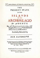 Ο Βρετανός περιηγητής Bernard Randolph (γεν. 1643) προσφέρει μία γενική περιγραφή της γεωγραφίας, της δημογραφίας (πληθυσμού, οικισμών, κάστρων), της (αγροτικής) οικονομίας, της κοινοτικής διοίκησης και της πολιτικής κατάστασης των νησιών του Αιγαίου Πελάγους στο τελευταίο τέταρτο του 17ου αιώνα. Η περιήγηση και η περιγραφή ξεκινάει (ελάχιστα έτη πριν το 1683) από την Εύβοια, συνεχίζεται με τις Κυκλάδες ('Ανδρο, Τήνο, Μύκονο, Νάξο, Μήλο, Πάρο, Αμοργό κτλ.), τα Δωδεκάνησα (Κω, Ρόδο, Λέρο, Σύμη, Κάρπαθο, Κάσο, Αστυπάλαια κτλ.), την Ικαρία, τη Σάμο, τη Λήμνο, την Τένεδο, τη Μυτιλήνη, τη Χίο, τα Ψαρά, τις βόρειες Σποράδες (Σκιάθο, Σκόπελο κτλ.), τις ακτές του Βοσπόρου και του Ελλησπόντου, καθώς και τη μεγαλόνησο της Κρήτης με το Ηράκλειο (Χάνδακα), τη Σούδα και τη Σπιναλόγκα. Η μονογραφία του Randolph αποτελεί πολύτιμη ιστορική πηγή για τις νησιωτικές κοινωνίες του Αρχιπελάγους λίγο μετά την πτώση του Χάνδακα (1669), και λίγο πριν την ολοκλήρωση και την παγίωση της οθωμανικής κατάκτησης των βενετοκρατούμενων ακόμη Κυκλάδων (πτώση της Τήνου, 1715). Το περιηγητικό του Randolph διανθίζεται με λιθογραφίες, που απεικονίζουν την Χαλκίδα, την Τένεδο και το σουλτανικό παλάτι στην Κωνσταντινούπολη, και έναν αλφαβητικό πίνακα με το γεωγραφικό μήκος και πλάτος των ελληνικών τόπων που επισκέφθηκε ο συγγραφέας.