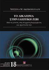 Το δικαίωμα στην ιδιωτική ζωή (the right to privacy) αποτελεί ένα από τα πλέον πολυσυζητημένα στη διεθνή βιβλιογραφία και διακινδυνευόμενα στο πλαίσιο της παγκοσμιοποίησης δικαιώματα. Το βιβλίο της Χ. Μ. Ακριβοπούλου, "Το δικαίωμα στην ιδιωτική ζωή, από τη γένεση, στη σύγχρονη διαμόρφωση και προστασία του" εισάγει το διάλογο αυτό στην ελληνική έννομη τάξη, διατυπώνοντας μια σύγχρονη θεωρία για τη γένεση, την εξέλιξη αλλά και τη σύγχρονη προστασία της ιδιωτικότητας, στην Ελλάδα αλλά και διεθνώς. Τα προβλήματα της ταυτότητας του προσώπου, της ανωνυμίας, της προστασίας των προσωπικών δεδομένων, της ιδιωτικότητας των δημοσίων προσώπων, της προστασίας του υποκειμένου στο διαδίκτυο αλλά και του απορρήτου των επικοινωνιών, όπως και θεωρητικά ζητήματα διάκρισης δημόσιου-ιδιωτικού και θεωρίας δικαιωμάτων αναλύονται σε βάθος μέσα από παραδείγματα της σύγχρονης ελληνικής αλλά και συγκριτικής, αμερικανικής, γερμανικής, ιταλικής νομολογίας αλλά και αποφάσεων του ΕΔΔΑ.