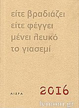 "Είτε βραδιάζει / είτε φέγγει / μένει λευκό / το γιασεμί": το αγαπημένο χαϊκού του Γιώργου Σεφέρη είναι ο τίτλος του ημερολογίου της Αιώρας για το 2016. Το ημερολόγιο κυκλοφορεί σε δύο εκδόσεις, το γνωστό και δημοφιλές εβδομαδιαίο και, για πρώτη φορά φέτος, το ημερήσιο, που μας έχουν ζητήσει πολλοί φίλοι και αναγνώστες.