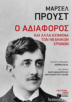 Στον Αδιάφορο, όπως και στο Πριν πέσει η νύχτα, κυριαρχεί ο πόθος. Το διήγηµα αυτό πρωτοδηµοσιεύεται την 1η Μαρτίου του 1896 στο La vie contemporaine et Revue parisienne reunies. Με τη συµπυκνωµένη αφηγηµατική πλοκή και το τέλειο κλείσιµο της ιστορίας ο συγγραφέας µένει πιστός στις υφολογικές απαιτήσεις του διηγήµατος. Ακολουθεί την οπτική µιας ερωτευµένης γυναίκας και θεµελιώνει τη φαινοµενολογία της παθιασµένης συνείδησης, µελετώντας και αναλύοντας τον έρωτα σε όλη τη διάρκειά του (από τη στιγµή που γεννιέται µέχρι το τέλος του), στις ποικίλες περιπλοκές του (κοινωνικές και διαπροσωπικές) και στη συναισθηµατική του υπόσταση (ο έρωτας στον Προυστ είναι ένας γολγοθάς)… (Από την εισαγωγή)