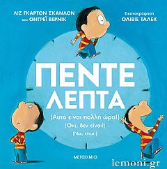 Πέντε λεπτά είναι πολύς χρόνος… ή μήπως όχι; Εξαρτάται, βέβαια, από το τι κάνεις! Ακολούθησε ένα αγοράκι στη διάρκεια μιας πολυάσχολης μέρας του, κατά την οποία ανακαλύπτει ότι μερικές φορές πέντε λεπτά μοιάζουν με αιωνιότητα –όπως όταν κάθεσαι στην καρέκλα του οδοντίατρου ή όταν περιμένεις στη σειρά για την τουαλέτα– και άλλες πάλι είναι ελάχιστα – όπως όταν παίζεις το αγαπημένο σου παιχνίδι ή όταν η μαμά σού διαβάζει το βράδυ πριν κοιμηθείς.