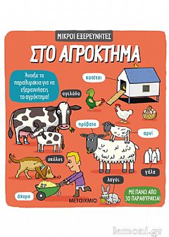 Καλούμε όλους τους Μικρούς Εξερευνητές! Ελάτε να πάμε μια βόλτα με το τρακτέρ στο αγρόκτημα για να γνωρίσουμε τα ζώα, τις καλλιέργειες και τα μηχανήματα του αγρότη. Άνοιξε τα παραθυράκια για να ανακαλύψεις τα μυστικά της κάθε εποχής και μάθε τι σημαίνει να είσαι αγρότης χάρη σε αυτό το χρήσιμο βιβλίο για τη ζωή στο αγρόκτημα.
