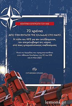 Η έκδοση περιλαμβάνει τα υλικά της Ημερίδας της ΚΕ του ΚΚΕ με θέμα «70 χρόνια από την ένταξη της Ελλάδας στο ΝΑΤΟ. Η πάλη του ΚΚΕ για την αποδέσμευση, τον απεγκλωβισμό της χώρας από τους ιμπεριαλιστικούς σχεδιασμούς», τις ομιλίες των βουλευτών του Κόμματος στη Βουλή, στη συζήτηση για την Ελληνοαμερικανική Συμφωνία για τις βάσεις, καθώς και αρχειακά και άλλα υλικά.