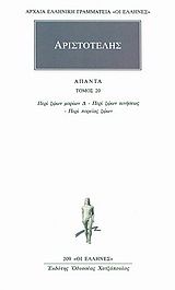 Περί ζώων μορίων Δ΄: Συνέχεια των παρατηρήσεων σχετικά με τα μέρη των ζώων, τη διάταξή τους και τις λειτουργίες που επιτελούν. Εμβρυολογία. Περί ζώων κινήσεως Σύντομο βιολογικό σύγγραμμα με αντικείμενο την κίνηση των ζώων σε σχέση με την κίνηση του κόσμου. Ερευνάται γενικά η κοινή αιτία της κίνησης οποιουδήποτε είδους. Εκούσιες και ακούσιες κινήσεις των ζώων. Από την κίνηση των ζώων η διερεύνηση μεταβαίνει στο ζήτημα του πρώτου κινούντος ακινήτου. Περί πορείας ζώων Θεωρητικό βιολογικό έργο που εξετάζει τα μέρη που χρησιμεύουν στα ζώα για την κίνησή τους, τη φύση του καθενός τέτοιου μέρους και την αιτία για την οποία τα έχουν τα ζώα. Εξετάζεται η «ύλη» των ζώων και ο τρόπος με τον οποίο είναι διατεταγμένη για να εξυπηρετήσει τους διάφορους σκοπούς τους.