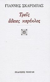 Γραμμένα σε διαφορετικές εποχές, από το 1931 έως το 1975, τα επτά διηγήματα που απαρτίζουν την τελευταία συλογή διηγημάτων του Γιάννη Σκαρίμπα, που εκδόθηκε το 1976 με τον τίτλο "Τρεις άδειες καρέκλες", αντανακλούν τη συγγραφική πορεία και πιστοποιούν τις κατακτήσεις του συγγραφέα στο χώρο της δημιουργικής πεζογραφίας. Τόσο η θεματική του όσο και η αφηγηματική του τεχνική δεν διαφοροποιούνται από το λοιπό έργο του, ενώ κυριαρχούν οι γνωστοί άξονες που συνέχουν τον πλασματικό του κόσμο: ο διαφορετικός άλλος, η παράδοση του Καραγκιόζη, η πρόσληψη και η ροή του χρόνου, η ζωή ως αντανάκλαση της τέχνης, ο κλόουν, η φάρσα. Και ενώ τα διηγήματα είναι γραμμένα σε διαφορετικές χρονικές στιγμές, συνδέονται υποδόρια -με εξαίρεση "Το λουλούδι της Μονεμπασιάς"- από τα καταλυτικά χαρακτηριστικά της προσωπικής γραφής του συγγραφέα: την ιλιγγιώδη γλώσσα, την υπονόμευση του ρεαλιστικού πεδίου, την αιώρηση μεταξύ πραγματικού και φανταστικού, το ειρωνικό ιδιόλεκτο, το παιχνίδι.